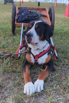 Greater Swiss Mountain Dogs (FCI standard, English translation), aka “Swissy” in the US, is a large, immensely strong working dog with a striking tri-color coat. While there is no “Lesser” Swiss Mountain Dog, the Bernese Mountain Dog, the Appenzeller Sennenhund, and the Entlebucher Mountain Dog are the other three related Swiss mountain breeds. A nice comparison picture, in the order above, is in the Wikipedia article on Swiss mountain dogs (auf Deutsch: Sennenhund). Note that in Europe, a “Swissydog” is actually a hybrid of the mountain breeds, not slang for a Greater Swiss as it is in the United States.