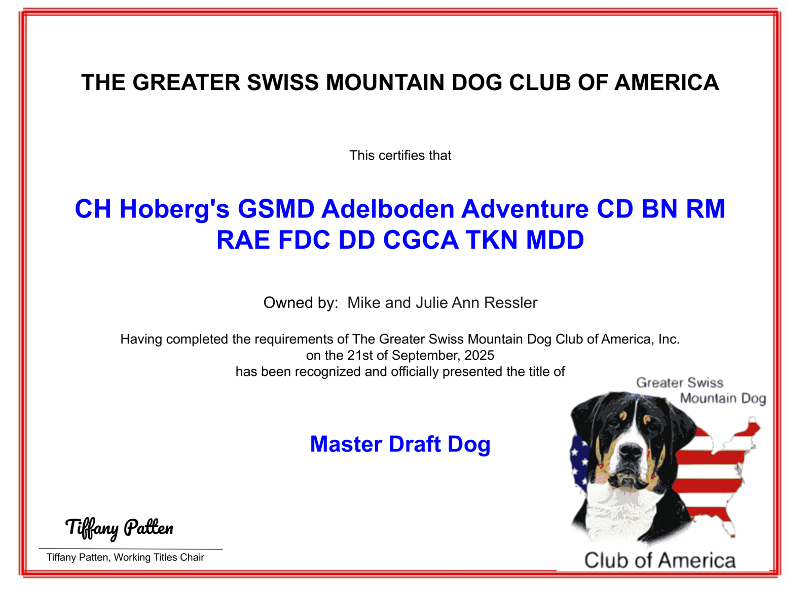 The GSGSMDC held their next draft test in Napa on April 12 and 13. Rüdi passed both his runs there in fine form, so that was up to three of his five passes toward MDD. Next up was the GSGSMDC “Route 66 Draft Test” in Williams, AZ, on September 20 and 21. Two more really nice runs, so Rüdi got all five needed passes, so Master Draft Dog Rüdi! I'm awfully proud of that title, so I was excited when I finally got the certificate.
