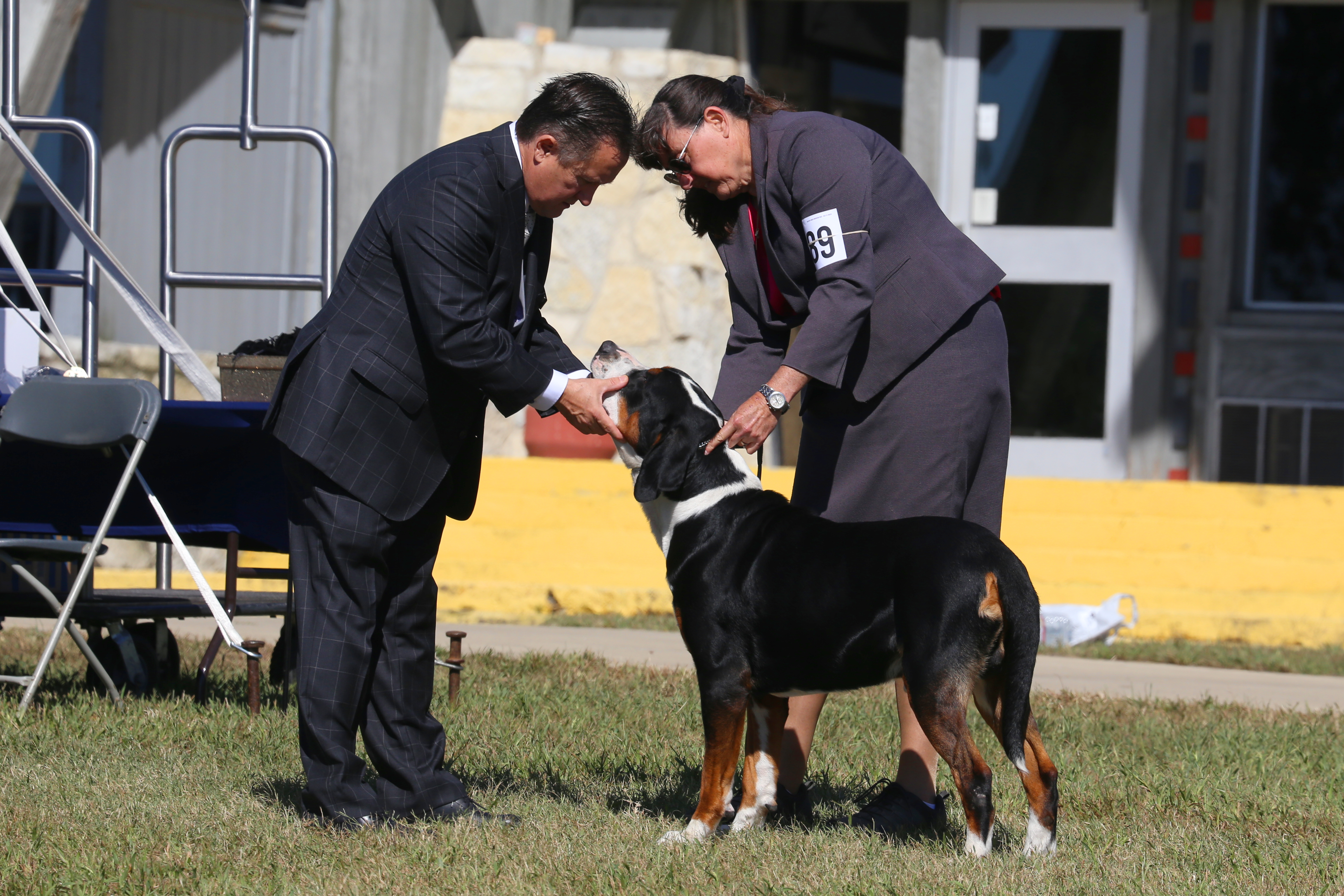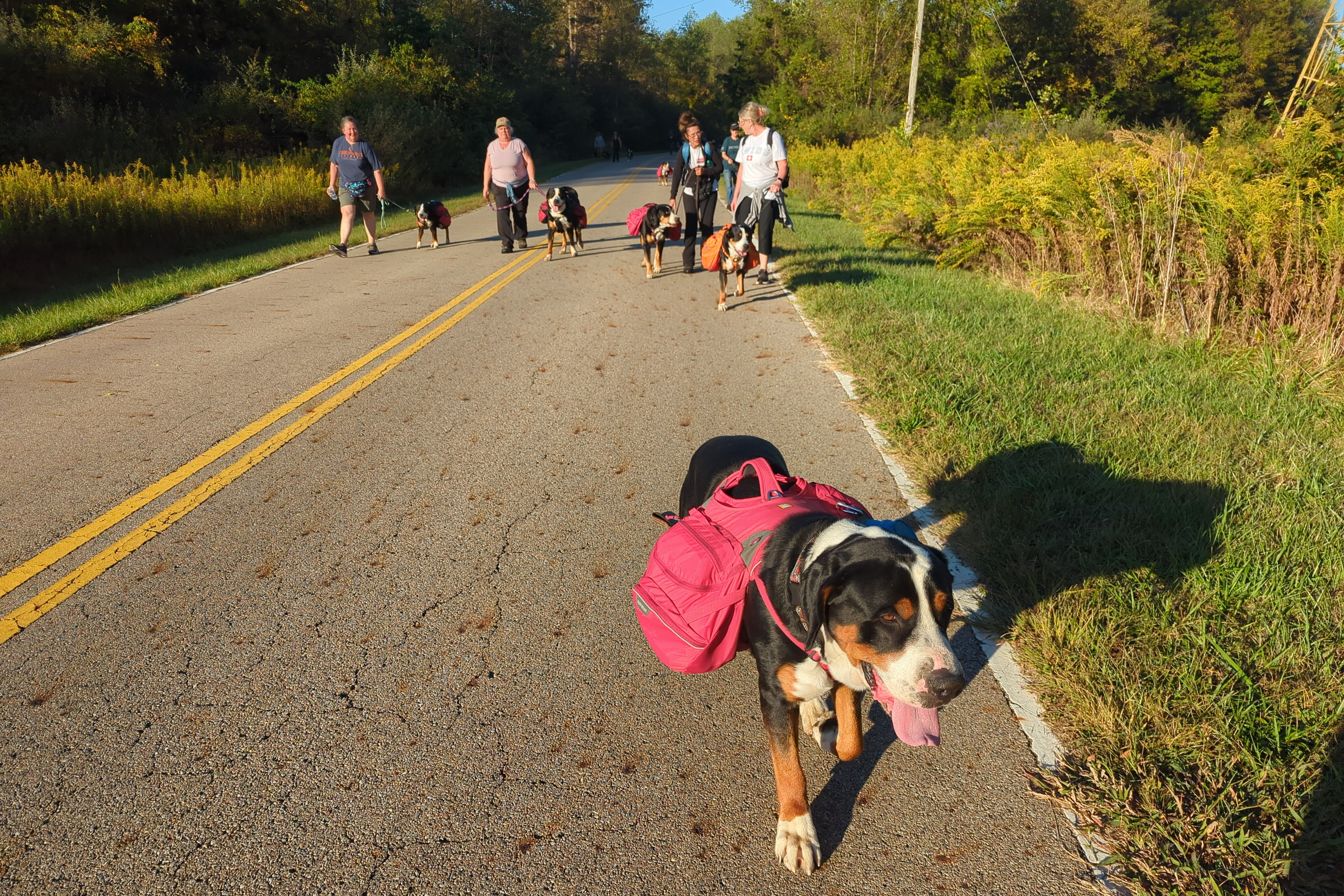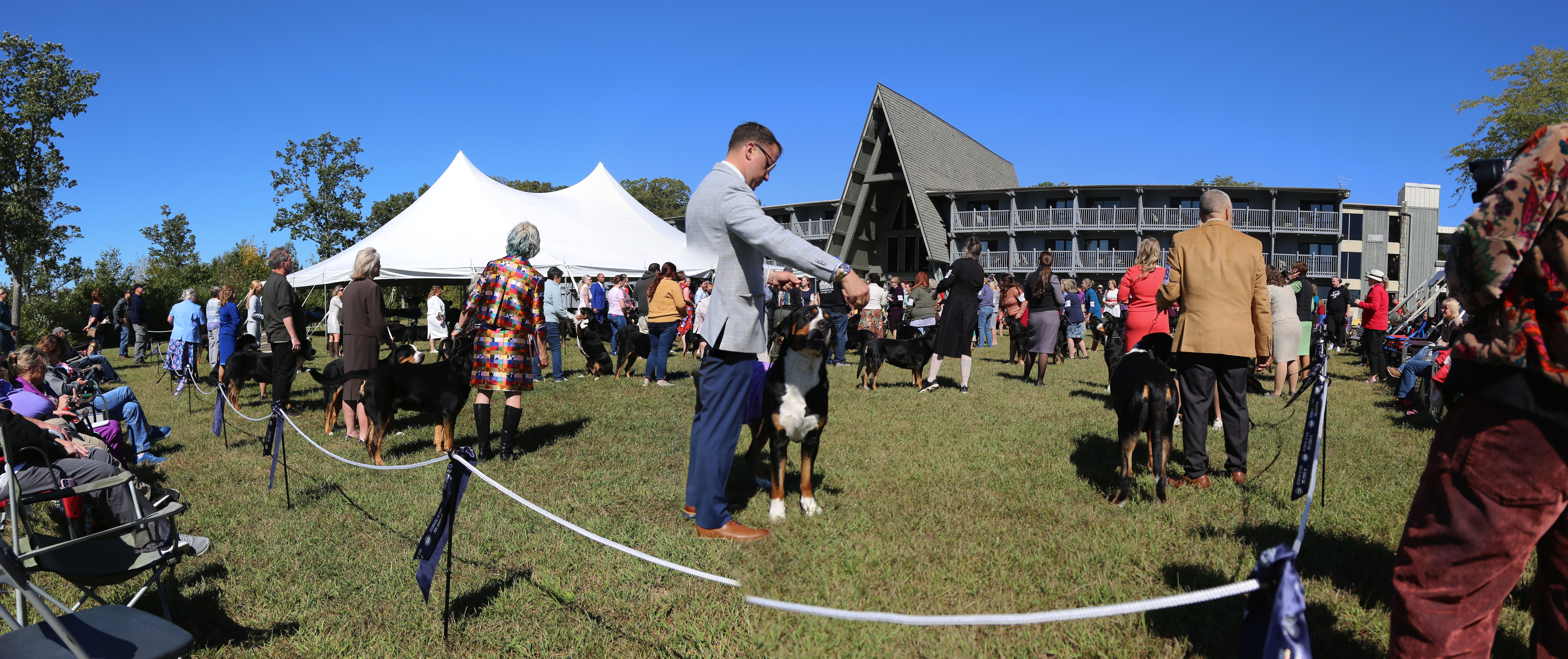 We again had the opportunity to go to the Swissy National Specialty in 2025, this time at the Hueston Woods Lodge and Conference Center in College Corner, OH, from October 4–9, with the Lake Shore GSMD Club Independent Specialty immediately after on the 10th and 11th. It was a loooong drive from California, but it was definitely worth it and a lot of fun as usual. This time there were over 240 Swissies registered, twice as big as the 2023 version, so there were just Swissies all over the place—the picture (click on it for a large version) attempts to show 100 champion Swissies (including Rüdi) in the ring at once.