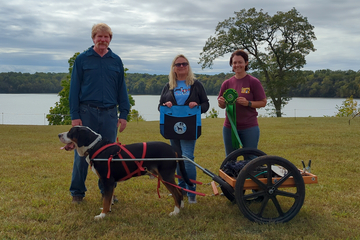 Later in the afternoon, after the rain stopped, was the weight pull. This was our first time doing it, so I wasn't really sure what to expect from Rüdi. Because of all the drafting we do, I didn't think he would have too much trouble figuring out how to do the pulls, and I was mostly right. Because this test had the cart they needed to pull on steel rails, Rüdi would have to pull 14 times his body weight to earn a qualifying leg. He weighed in at 122 lbs, so he needed to pull 1708 lbs to qualify. The empty cart was 450 lbs, and they added weight in 198 lb increments. You are allowed to skip increments, so I decided to do every other weight, just to give him some experience. I didn't repeat the empty cart practice runs, so Rüdi officially pulled 648, 1044, 1440, and then 1836 lbs to earn his first qualifying leg. At the Independent Weight Pull the following Saturday, he did the same sequence to earn his second leg, but then we added in 2034 lbs just to brag that he pulled over 2000 lbs. For full disclosure, I should point out that the top dogs were pulling over 5000 lbs, so 2000 isn't really that impressive, but I didn't want to abuse him, either, so we stopped there. It still got him 3rd place in his weight class!