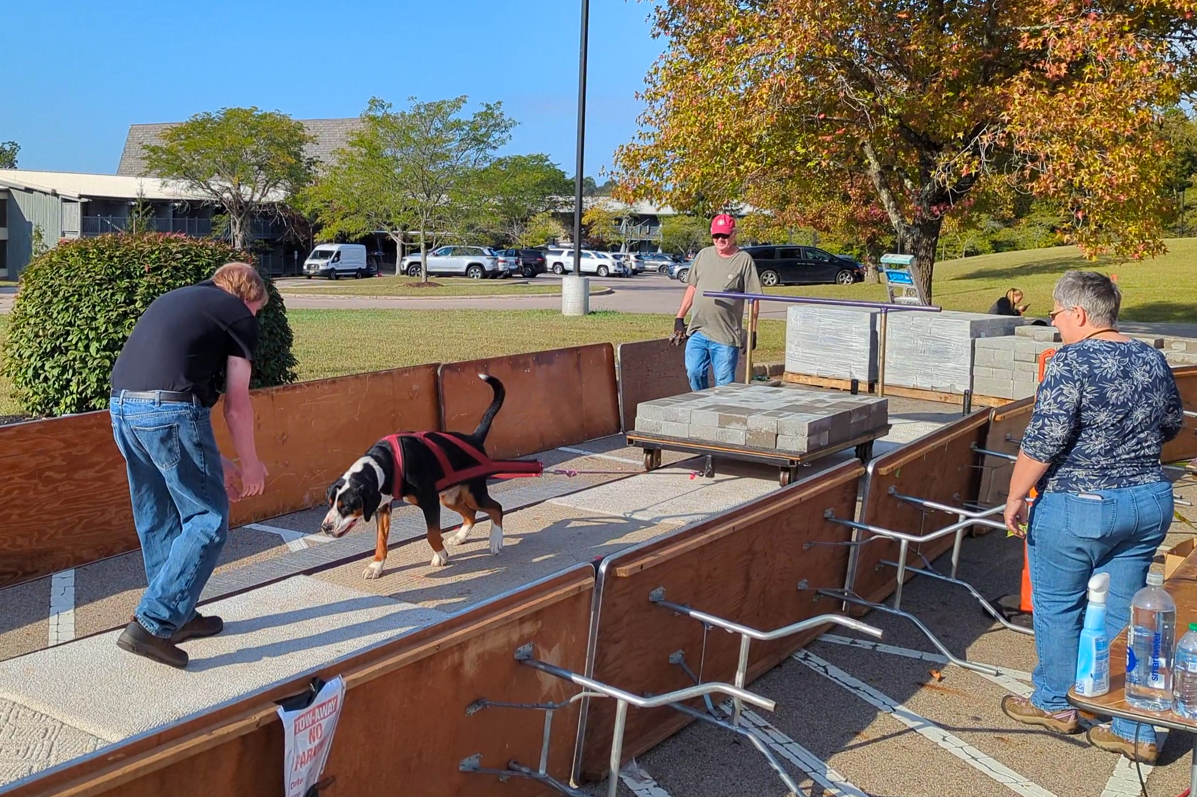 Where I do care a lot is in the activities, and here Rüdi had a fantastic specialty. Pack hiking was the first event of the specialty, so on Sunday we did a 10 mile pack hike for our first qualifying pass (out of four needed) for a pack hike title. It was a really pretty and mostly level hike through the woods surrounding Acton lake where the lodge and conference center are located, but I think Rüdi was mostly just saying “Do we really have to do this?” for the last two miles. However, he did just fine, and so we had our first ribbon in the bag.